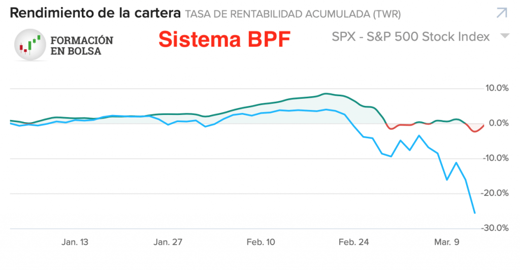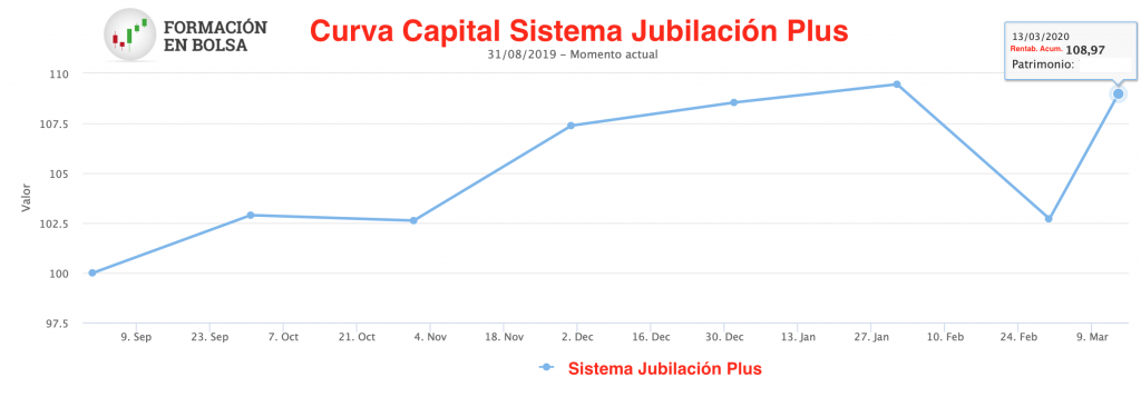Como puedes ver en el gráfico siguiente el Sistema Jubilación Plus sufrió las caídas de finales de febrero pero reaccionó a tiempo rotando y traspasando el capital a un activo más seguro.