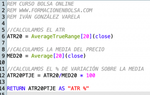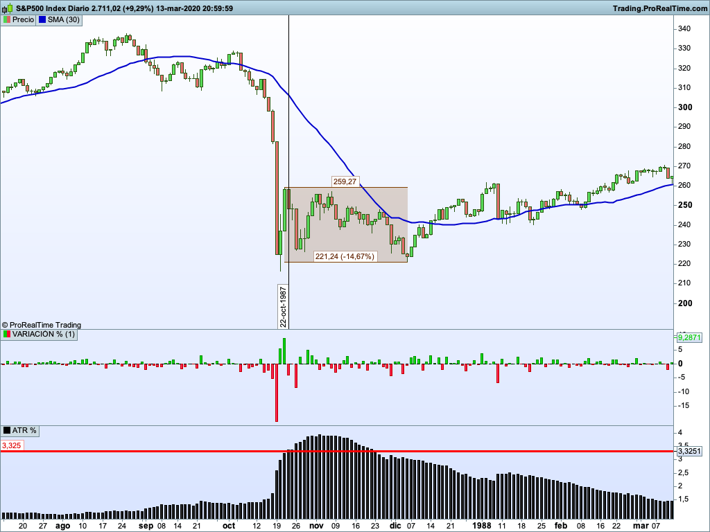 En el gráfico anterior puedes ver cómo el ATR creció súbitamente tras el crash de octubre de 1987. Entre el gráfico del precio y el ATR hay un indicador que he programado que se llama variación % y que muestra el % de variación del precio en la jornada.