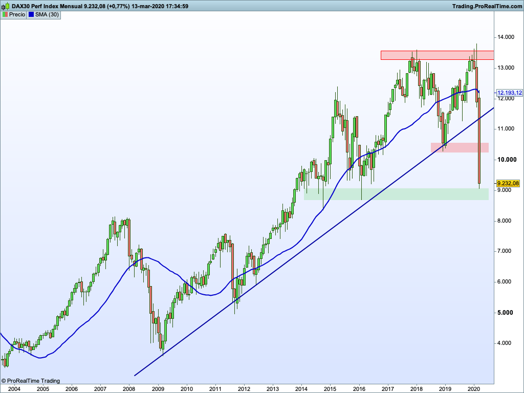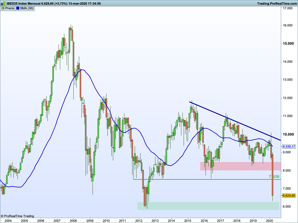 Voy a empezar primeramente por analizar el Ibex en un gráfico mensual. Como puedes ver en el gráfico de abajo este mes se han roto niveles muy importantes que nos han hecho retroceder hasta 2012… Esto es un indicativo porque nos da una idea de la fuerza que tiene nuestro mercado comparado con el mercado americano o el alemán.