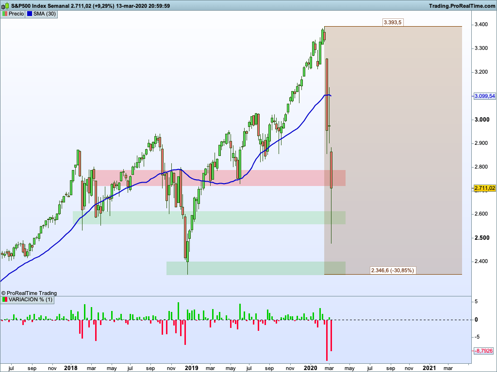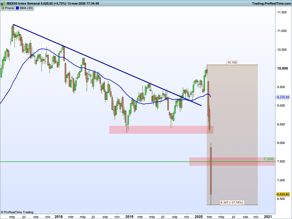 En el gráfico semanal vemos la tremenda caída que ha sufrido el mercado español. ¡Un 37,16% de caída en tan solo 3 semanas! En el gráfico mensual veíamos que la zona de soporte actual está en el entorno de los 6.000 puntos.