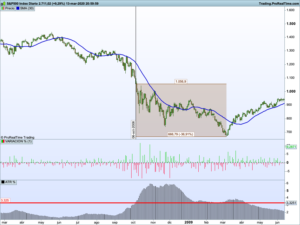 En octubre de 2008 el mercado alcanzó los niveles de volatilidad actual (3%). A diferencia de lo que ha ocurrido estas semanas, en 2008 el aumento de la volatilidad fue progresivo y el precio venía ya en tendencia bajista. La volatilidad siguió en aumento llegando a duplicarse y perdiendo un 37% más de lo que había perdido hasta aquel momento…