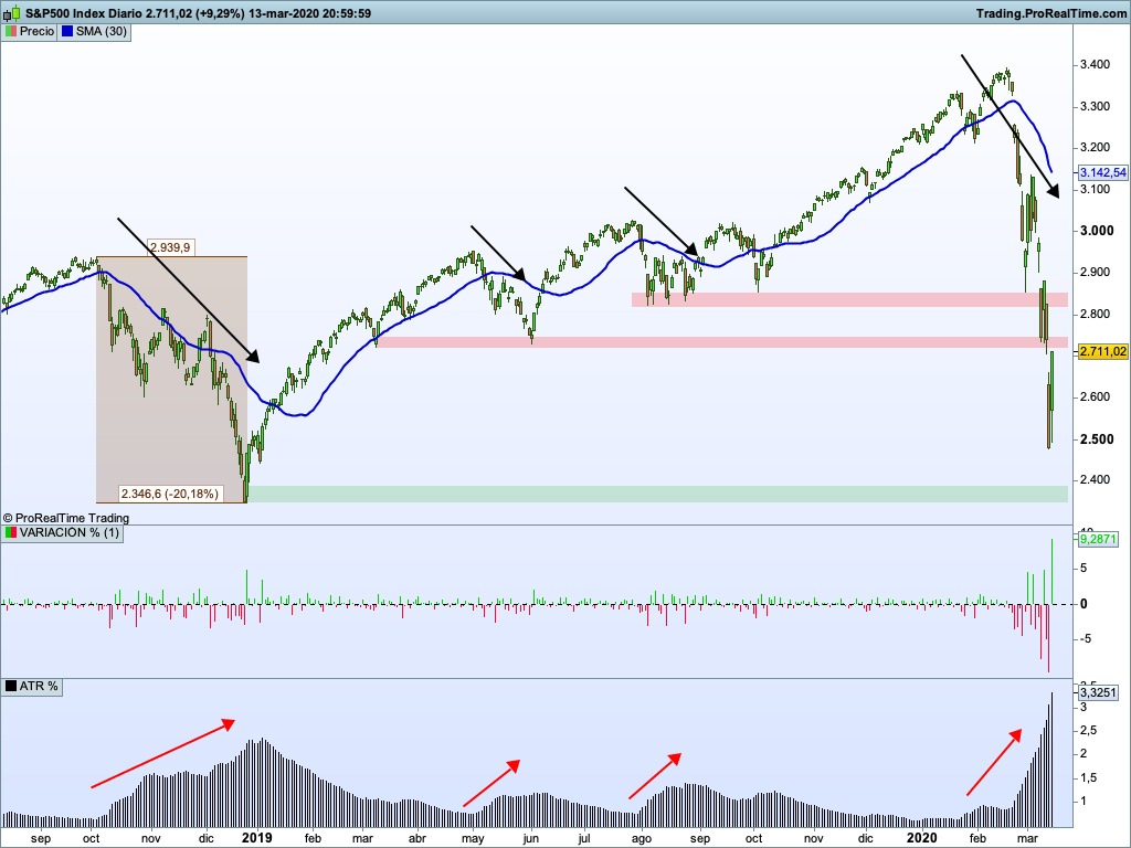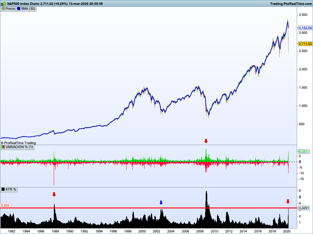 A diferencia del crash del 87, el momento en el que el ATR alcanzó niveles tan significativos como el actual se produjo tras varios meses estando el mercado en tendencia bajista.