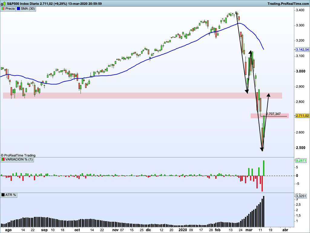 Veamos en este gráfico del Sp500 cómo la volatilidad ha ido creciendo día tras día.