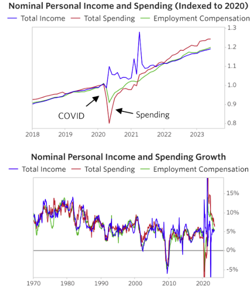 Este primer par de gráficos que se muestran a la izquierda a continuación muestra el ingreso total (que incluye el dinero distribuido a través del gobierno), el ingreso laboral y el gasto total.