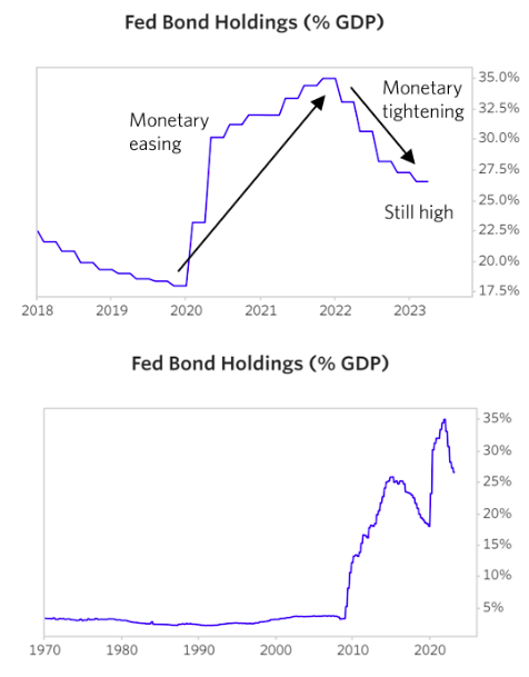 Esto tuvo lugar en 2020 y 2021, cuando hubo enormes déficits presupuestarios (por ejemplo, entre el 10% y el 14% del PIB en EE. UU.) y enormes compras de bonos por parte de los bancos centrales (por ejemplo, las tenencias de bonos de la Reserva Federal aumentaron del 18% al 35% del PIB) para mantener las tasas bajas a cero o menos.