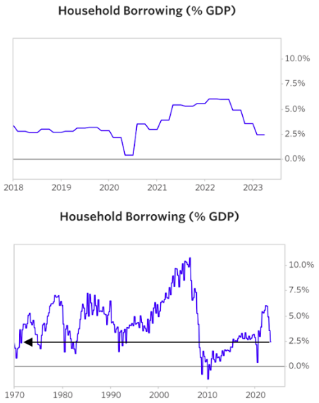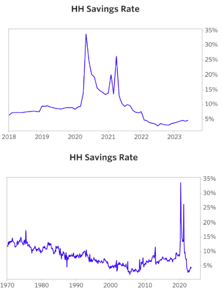 Como también se puede ver en el gráfico superior, el gasto se desplomó al principio durante la COVID y luego aumentó y se recuperó de manera constante. Como siempre ha demostrado ser el caso, cuando se le da a la gente dinero y crédito con incentivos para gastarlo, encontrarán una manera de gastarlo.