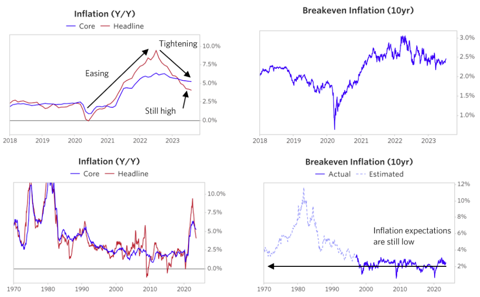 Los siguientes dos pares de gráficos muestran la inflación y la inflación de equilibrio tal como se reflejan en los mercados de bonos.