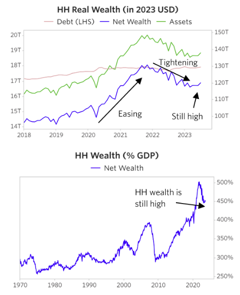Como puede verse, las deudas reales se mantuvieron estables y los activos reales aumentaron, por lo que los patrimonios netos se dispararon. Se dispararon a nuevos máximos en respuesta a los estímulos fiscales y monetarios y disminuyeron un poco debido al ajuste de la Reserva Federal, pero siguen siendo muy altos según medidas históricas.