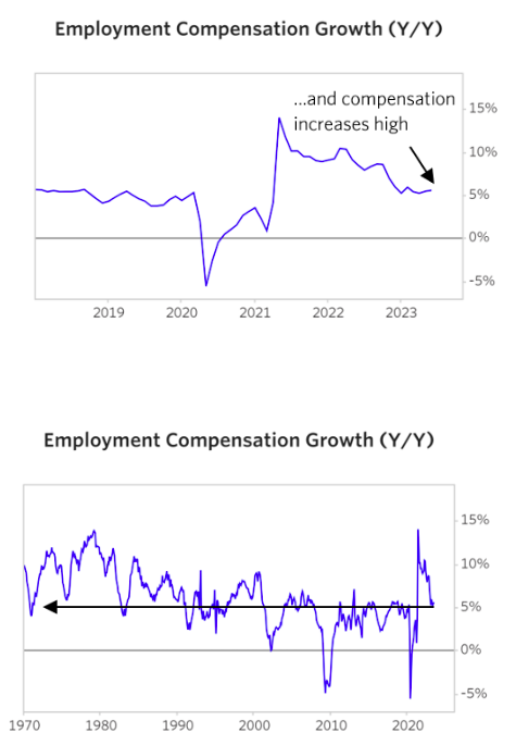 Al mismo tiempo, se dispararon los aumentos de las remuneraciones. Como se refleja tanto en los dos pares de gráficos anteriores como en estos dos pares, los balances y las cuentas de resultados han sido sólidos.