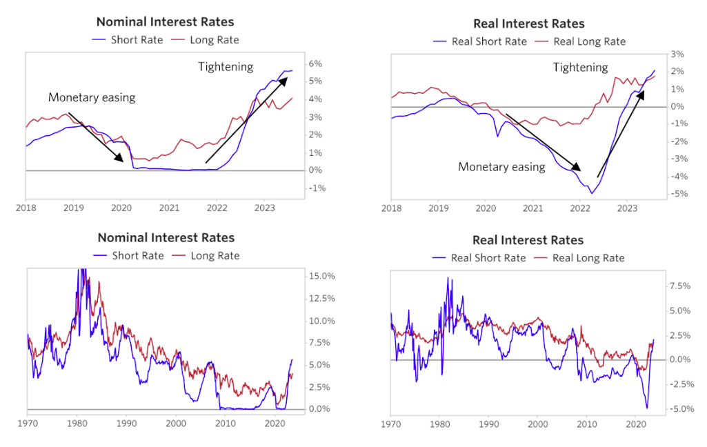 Luego, en 2022, con una inflación galopante y un desempleo bajo, hubo un movimiento hacia políticas fiscales menos laxas (por ejemplo, una reducción del déficit presupuestario de Estados Unidos de un 12% del PIB a un 5-6% del PIB), y hubo rápidos movimientos por parte de los bancos centrales que se alejaron de políticas monetarias increíblemente laxas (por ejemplo, -1,5% de tasas reales de bonos con una enorme expansión del balance a un nivel más normal de estrechez con +1,5% de rendimientos reales de los bonos y una contracción gradual del balance) en los EE.UU.