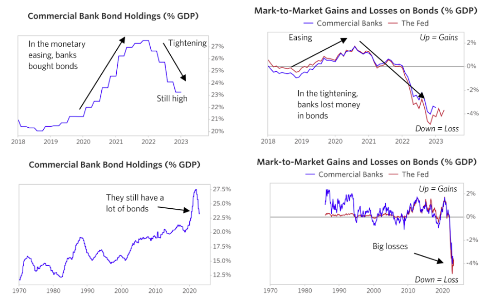 Los dos pares de gráficos siguientes muestran las tenencias de bonos de los bancos comerciales (a la izquierda) y las ganancias y pérdidas a precios de mercado de los bancos comerciales y la Reserva Federal (a la derecha).