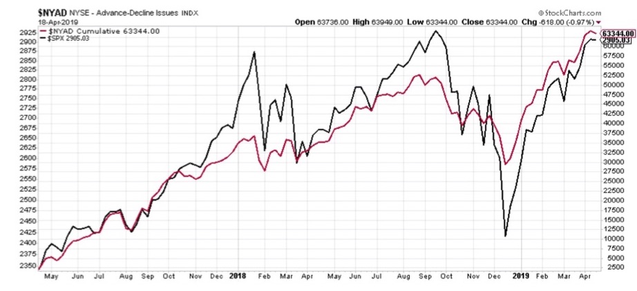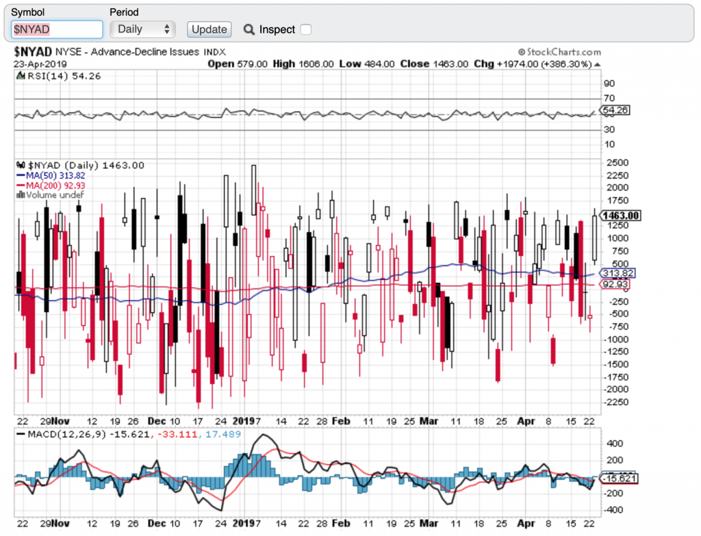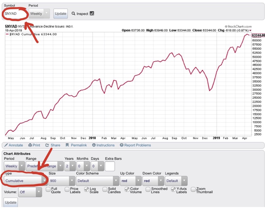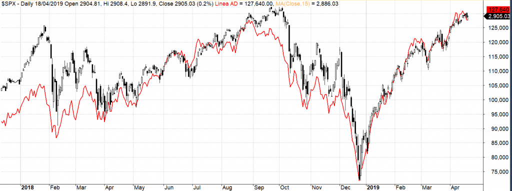 En el gráfico anterior puedes ver la línea avance-descenso y el índice sp500. ¡Perfecto para poder detectar divergencias!