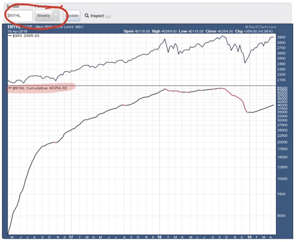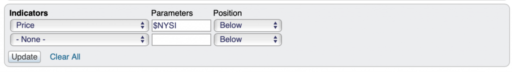Sólo hay que teclear el ticker $NYSI para representar el summation índex. Como puedes ver en la imagen anterior yo lo he puesto en la parte de «indicators» y debajo del precio (below). En esta ocasión además he introducido en el gráfico de velas el índice NYSE tecleando $NYSE.