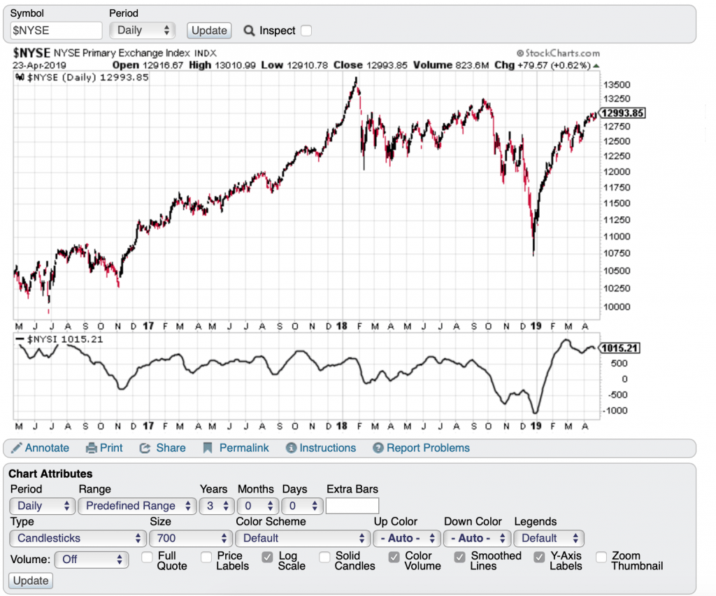 Sólo hay que teclear el ticker $NYSI para representar el summation índex. Como puedes ver en la imagen anterior yo lo he puesto en la parte de «indicators» y debajo del precio (below). En esta ocasión además he introducido en el gráfico de velas el índice NYSE tecleando $NYSE.
